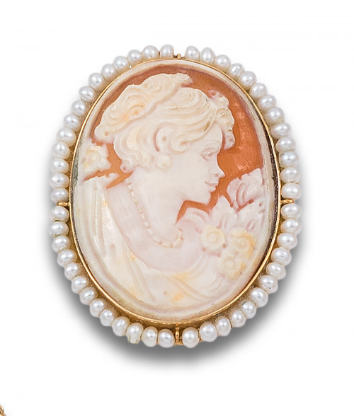 Camafeo con efigie de dama decimonónica en montura de oro amarillo de 18 kt. y orla de perlas cultivadas. Adaptado a broche y colgante.