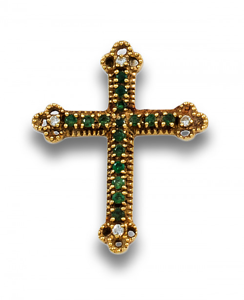 Colgante en forma de cruz en oro amarillo de 18 kt. con hileras de esmeraldas, talla brillante, rematada en forma polilobulada con diamantes al centro, talla brillante.Peso: 6,6 Gr..