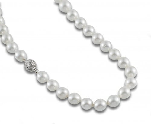 Collar formado por 36 perlas australianas dispuestas en ligero degradé de 14 a 12.5 mm. de diámetro, de gran perfección por su sedoso oriente. Cierre esfera de oro blanco de 18 kt. cuajado de diamantes, talla brillante, peso total estimado de 0.70 ct.