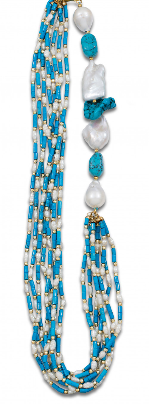 Collar multihilos de cuentas de aulita, perlias de río y perlas cultivadas barrocas, con detalles de metal dorado.