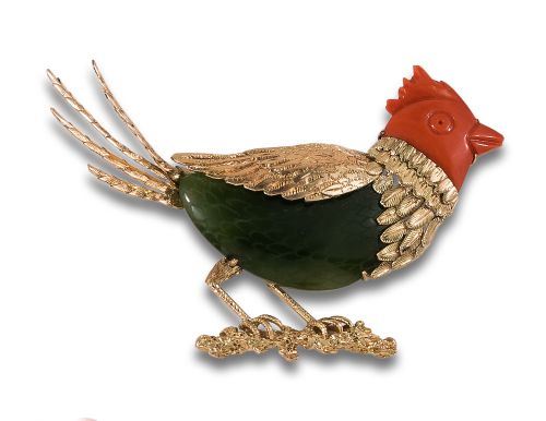 CORAL AND NEPHRITE BIRD BROOCH, IN YELLOW GOLD