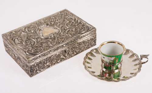 Caja en plata, Madrid Villa y Corte, Durán,1910. Con alma de madera, decoración de rocalla, roleos, mascarones y aves. Marcas en la tapa.