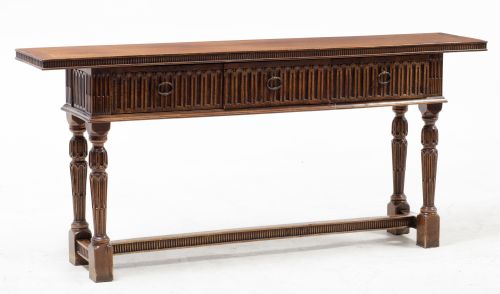 Made of carved oak with gilded iron handles. Needs review and lack of gilding on the handles. Measurements: 80 x 175 x 35 cm