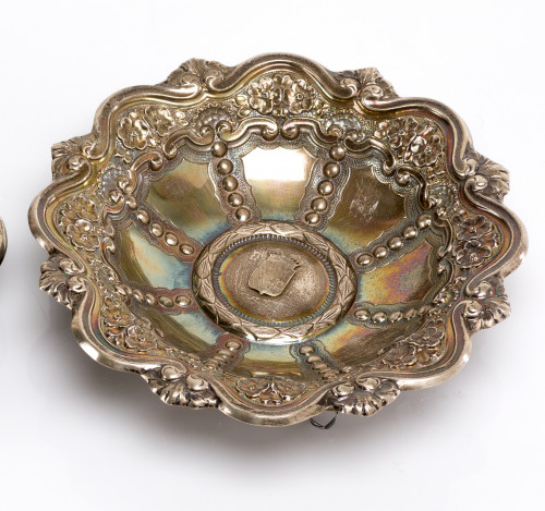 Centrito en plata, con borde ondulado y escudo central y bandas de perlas. Peso: 195 gr.