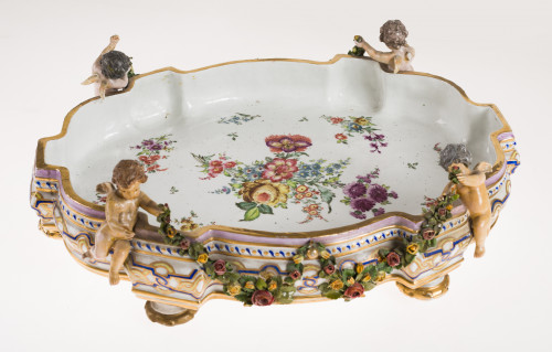 Centro de porcelana esmaltada y vidriada, Wallendorf, Alemania, S. XX. Con decoración de flores en el asiento y cuatro figuras de angelotes sujetando una guirnalda de flores en relieve. Presenta faltas y restauraciones. Marca en la base.