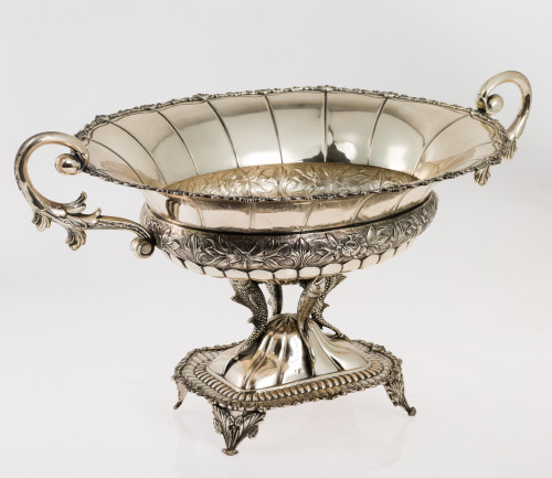 Centro en plata española, Ley 916, S. XX. Decoración gallonada y reelevada de flores y rocalla, con cuatro peces en el fuste. Marcas en la base.