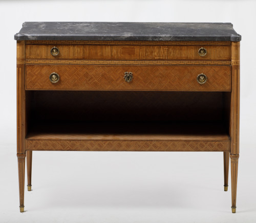 Comoda de gusto neoclásico, posiblemente Herráiz, España, med. S. XX. Chapa en placage con motivos geométricos. Tapa de mármol gris partida. Dos cajones en el frente y balda inferior. Precisa repaso.