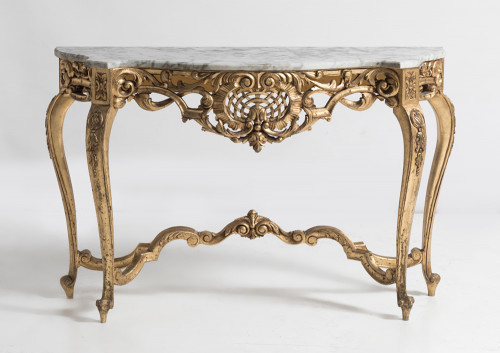 53 Consola dorada con tapa de marmol Consola estilo Luis XV, en madera tallada y sobredorada. Tapa de mámrol blanco veteado Consola estilo Luis XV, en madera tallada y sobredorada. Tapa de mámrol blanco veteado Consola estilo Luis XV, en madera tallada y sobredorada. Tapa de mámrol blanco veteado