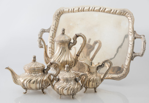 Composed of a tray, coffee maker, teapot, milk jug and sugar bowl. Turned decoration and lids topped with acorns. Small dents. Contrasted markings on the bases. Total weight: 3,845 gr. Measurements: 38 x 60 cm, the tray