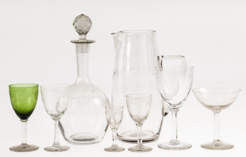 Cristalería grabada, pps. S. XX. Compuesta por: 11 copas de agua, 12 copas de vino tinto, 12 copas de vino blanco, 11 copas de vino dulce, 11 de licor, 11 copas de champagne, 1 jarra de agua y 1 licorera. Decorada con greca de gallones y veneras.