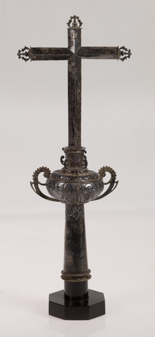 Cruz de altar realizada con una antigua macoya de plata y una cruz latina, también de plata, con remates de volutas. Montada en peana octogonal de madera lacada en negro.