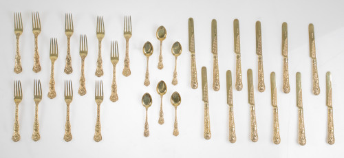 Cubertería de merienda en plata inglesa sterling vermeille S.XIX-XX. Diferentes marcas. años 1876, 1887 y 1918. Consta de 12 cuchillos (hojas de plata), 12 tenedores y 6 cucharas. Mangos con decoración de escenas de caza en relieve y entrelazos vegetales.