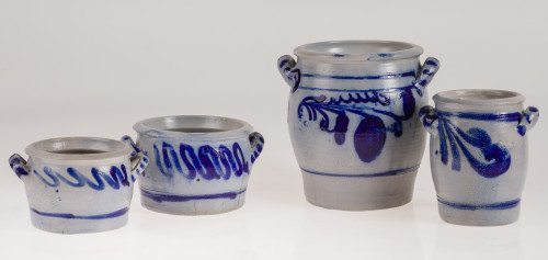 Dos "Tarros holandeses" achatados y con asas, med. S.XX. De cerámica gres vidriada y esmaltada a la sal con decoración en azul cobalto. Pelo en uno de ellos.