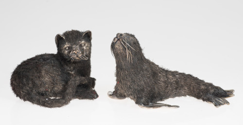 Dos figuras de cachorros de foca y gato en plata italiana, ley 925, Italia, S. XX. Siguiendo los modelos de Mario Buccelatti, realizados con finos hilos de plata imitando pelo.