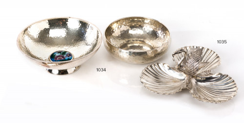 26 Lote de dos recipientos de plata con trabajo ma rtele Lote de dos recipientes en plata punzonada, de perfil circular con trabajo martelé. Uno Ley 916 con motivo de esmalte