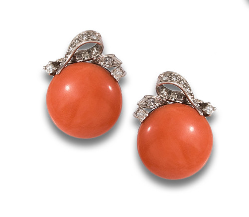 EARRINGS, 60'S, WITH DIAMONDS AND CORAL, IN PLATINUM