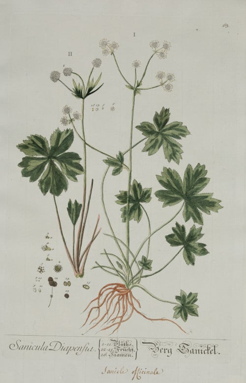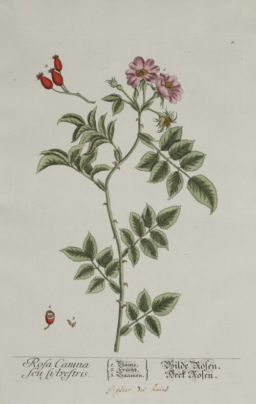 2 hand-colored copper engravings - Rosa Canina seu silvestris. (Flower, 1; Fruit, 2; Seed, 3). Laxative, general tonic, healing. - Diapensia Sanicula (Flower, 1-11; Berries, 12-15; Seed, 16). Antiseptic, antibacterial, etc. Painted by NF Eisenberger, for: “Herbarium Blackwellianum” Measurements: Print: 29.7 x 19.3 cm each