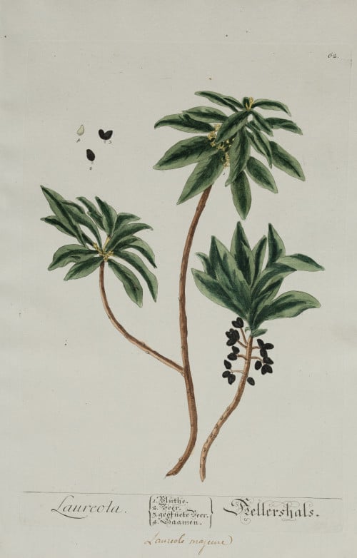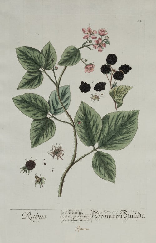 2 hand-colored copper engravings - Rubus: Blackberry. Raspberry. Acts against cardiovascular diseases. -Laureola. (Daphne laureola). Acts as a laxative, emetic, etc. Painted by NF Eisenberger, for “Herbarium Blackwellianum”. Measurements: Footprint: 29.7 x 19.3 cm each
