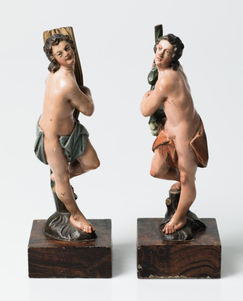 Concebidos como alegorías eucarísticas y relacionadas con los pasajes bíblicos de la tierra de promisión, esta pareja de esculturas formaron parte de la decoración de un espacio destinado a la adoración eucarística del Santísimo Sacramento. Con una decoración polícroma parcialmente refrescada, las dos esculturas se presentan sobre bases de madera.