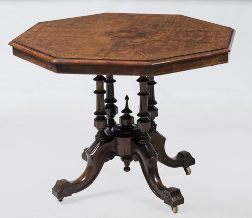 Burl veneer and lemongrass marquetry. Tilt-top mechanism, carved and turned central leg. Dimensions: 75 x 97 x 97 cm