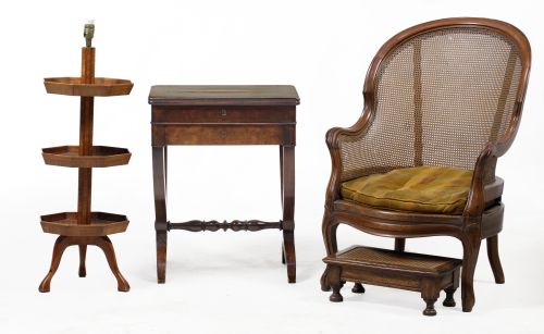 Made of oak and mesh. They require review. Measurements: 95 x 64 x 48 cm the chair; 16 x 45 x 24.5 cm footrest
