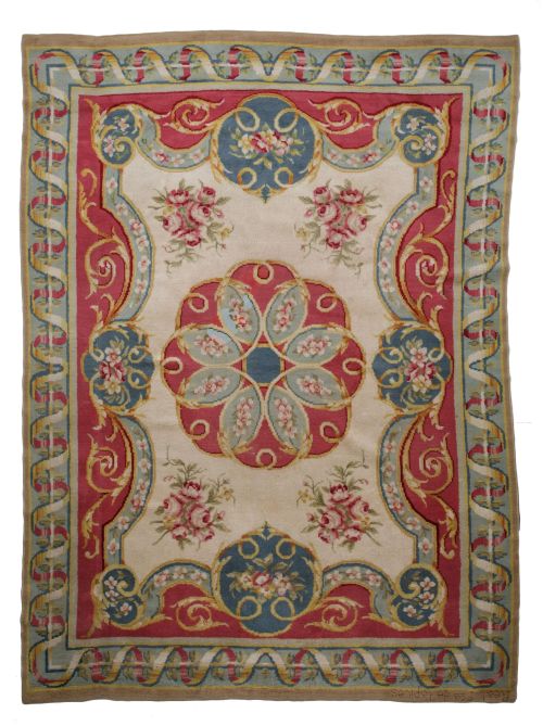 Beige color with decoration of medallions, seed beads, flowers and bows. Signed "Royal Fca de tapestry". Has wear and tear. Restorations. Measurements: 381 x 278 cm