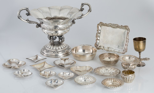 In the shape of a gallon cup, with embossed flower garland decoration, shaft with 4 swans and scroll handles. Contrasted markings on the base. Weight: 600 gr. Measurements: 25 x 38 cm