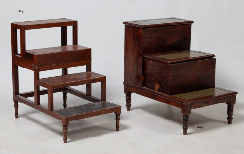Con tres escalones de cuero verde gofrado. Dos compartimentos disimulados uno de ellos con orinal de loza. Faltas y precisa repaso.