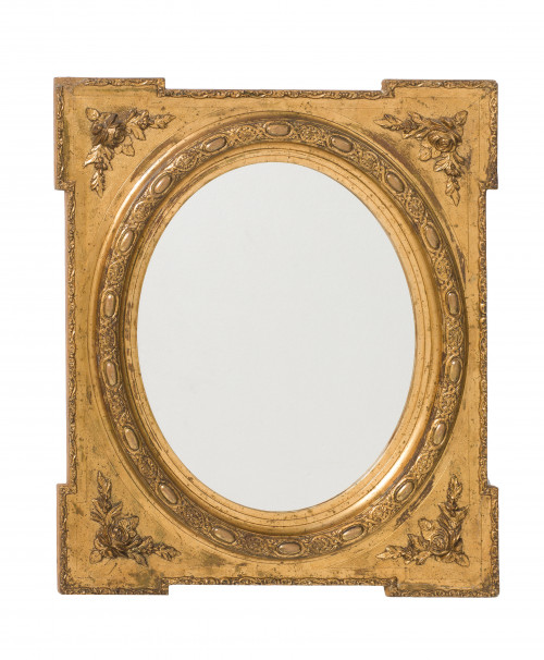 Espejo con marco de madera tallada, estucada y dorada, siguiendo modelos del S.XIX. Decoración de rosas en las esquinas. Presenta redorados y pequeñas faltas. Medidas: 76 x 66 cm