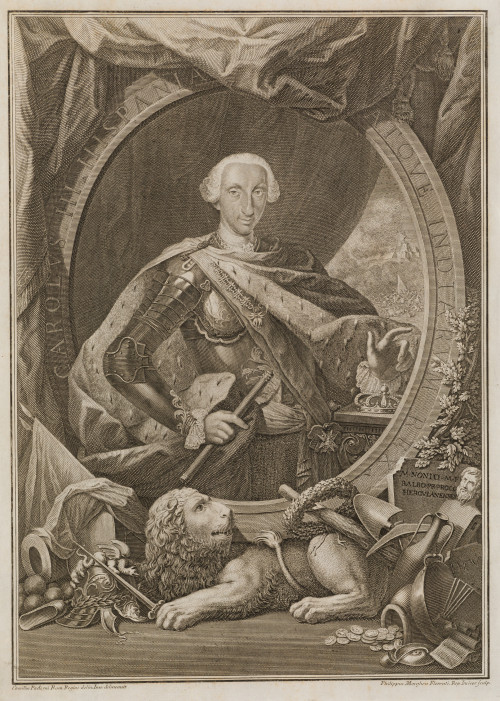 Carlos III representado con armadura, capa de armiño, toisón de oro, bastón de mando y corona. Batalla al fondo. Al frente: león con espada, cañón, munición, banderas, casco laureado en alusión a la Guerra de los Siete Años. A la dcha: hallazgos de las excavaciones de Herculano.