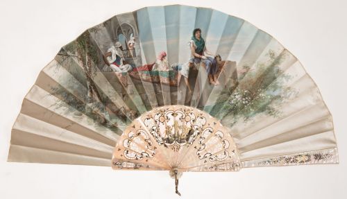 Ribs with openwork decoration of rocailles, cutout leather, and cupids. Border with painted oriental scene decoration signed "J. Gomez H.". Minor flaws. Measure: 31 cm, closed.