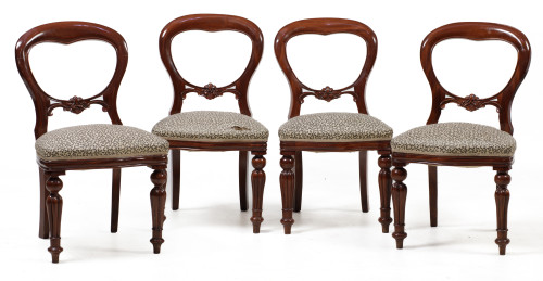 Mahogany with fluted legs and curved backrest. Measurements: 89 x 47 x 45 cm each