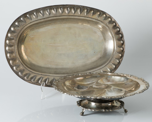 Fuente en plata sterling ley 925. Recipiente superior dividido en secciones, con sistema giratorio. Borde con greca de acanto.