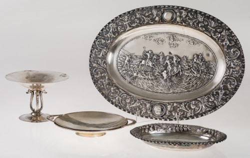 Gran fuente ovalada en plata española contrastada, ley 916, med. S. XX. Con decoración repujada representando la "Batalla del Guadalete". Marcas en el asiento. Pequeñas abolladuras.