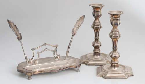 Stand with claw feet and palmette decoration on the edge, two quill-shaped pens and document holder. It has small flaws. With trademarks and commercial labels on the base. Weight: 410 gr Measurements: 12 x 29 x 16 cm; 20cm feathers