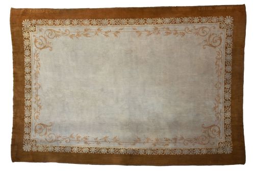 Beige color and brown border with flower and rocaille decoration. Signed Royal Tapestry Factory, G. Stuyck, Madrid, 1890. Shows wear. Measurements: 565 x 378 cm