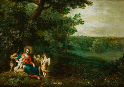 "Paisaje con la Virgen, el Niño, san Juanito y dos ángeles ofreciendo flores"