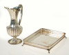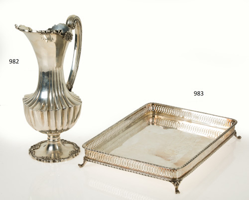 Jarra de plata española, ley 916, S. XX. Con decoración gallonada y base embocadura repujada con rocallas.