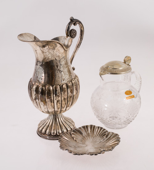 Lote compuesto por jarra de plata con decoracion de gallones (con contrapeso) y pequeño dentro con decoracion de hojas en plata española contrastada ley 916.