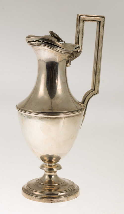 Jarro en plata con marcas de Madrid Villa y Corte 1803, platero AR? posiblemente Juan Manuel Arán. Cuerpo liso de copa abalustrada, con decoración moldurada, y asa de siete. Tapador con pomo de rana, Altura: 31 cm. Peso: 1,100 gr.