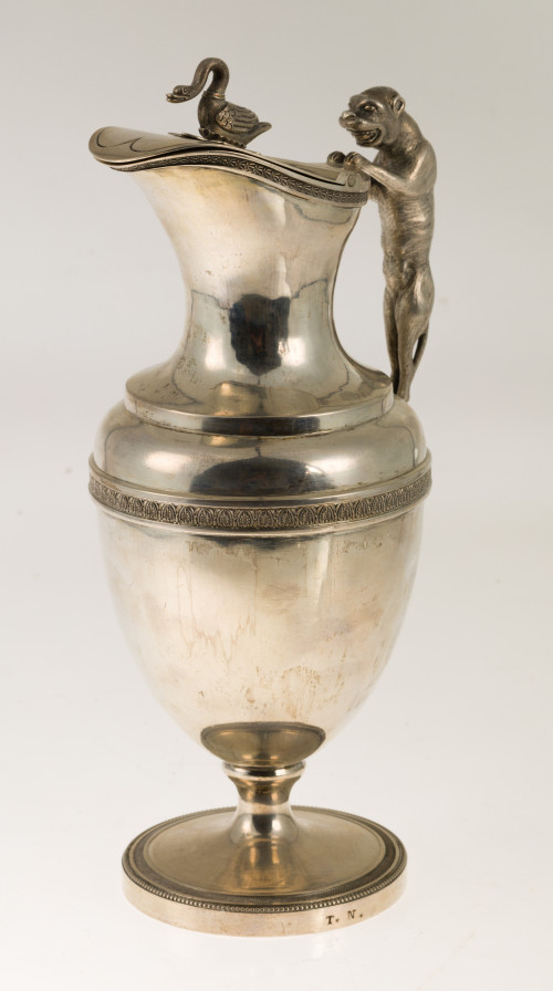 Jarro en plata con marcas de Vitoria, S.XIX, Argandoña y Maison. Cuerpo liso con grecas de perlas y palmetas. Asa con figura de felino en bulto redondo y pomo de cisne. Altura: 30 cm. Peso:1.120 gr. Iniciales grabadas T.N. en la base.