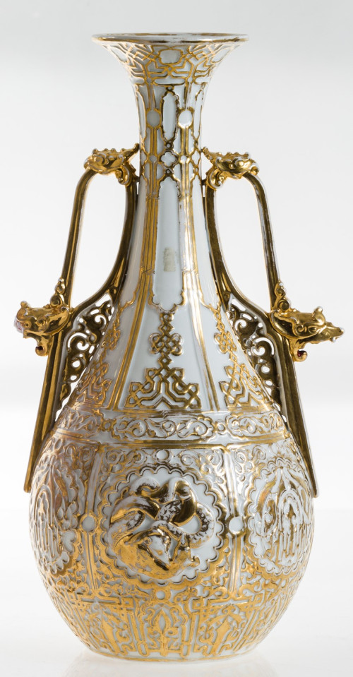 Jarrón de porcelana esmaltada y dorada, España, c. 1900. Con decoración inspirada en motivos de la Alhambra. Pérdidas en el dorado. Faltas.