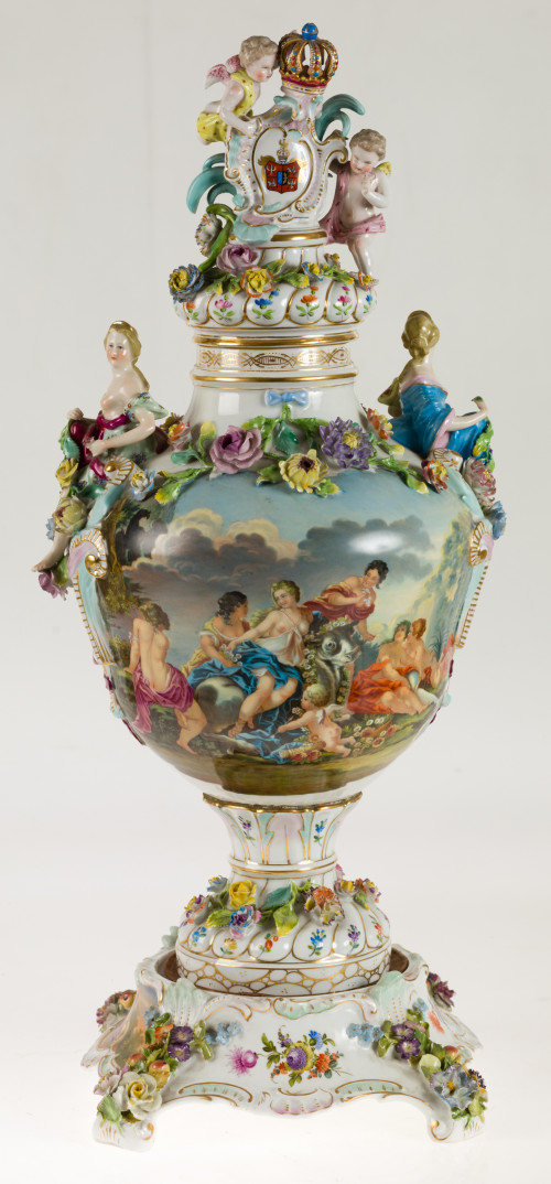 Jarrón en porcelana alamena de Dresde S.XX, con marcas en la base, siguiendo antiguos modelos de Meissen. Fondo vidriado en blanco con decoración en policromía y escena mitológica en reserva central. Figuras aplicadas en bulto redondo y guirnaldas florales. Altura: 70 cm total.