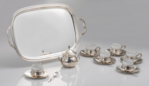 Juego de café de plata, ley 800. Consta de 6 tazas con pocillos de porcelana de Limoges esmaltadas en blanco con perfil dorado y 6 platos, 6 cucharillas, azucarero y bandeja. Marcas en las bases.