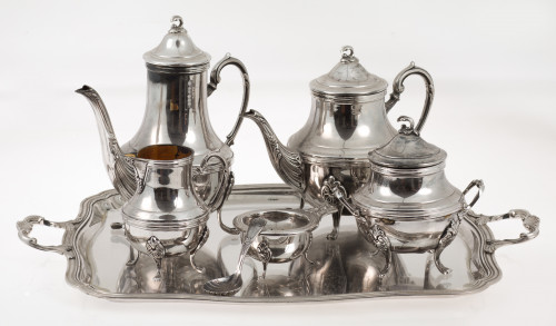 Contiene bandeja, cafetera, tetera, azucarero con su cucharita, jarrita de leche y colador. Interiores sobredorados. Con su estuche original.