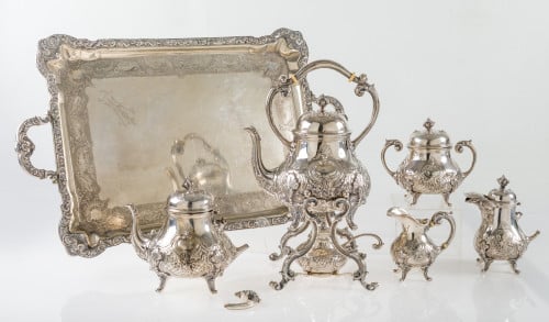 Compuesto por samovar, cafetera, tetera, lechera, azucarero y bandeja asociada con marca de Oporto. Con decoración de rocallas y veneras e iniciales grabadas en la bandeja. Tetera y cafetera con asas rotas. Marcas en las bases.