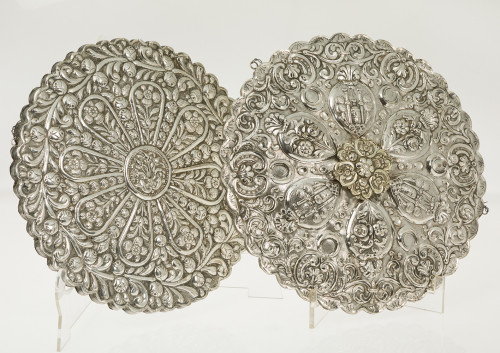 Juego de dos espejos de plata turca, med.S.XX Con decoración repujada, uno con motivos florales y otro con motivos florales y arquitectónicos. El segundo con faltas en el marco y pérdidas de mercurio en la luna. Medidas: 30 cm, el mayor.