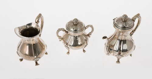 Juego de té individual en plata española ley 916. Consta de cafetera (tapa necesita soldadura), lechera y azucarero. Peso total: 495 gr.