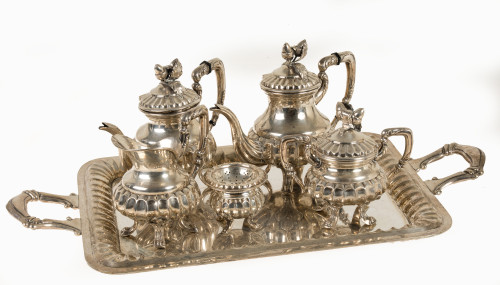 Con decoración de gallones cóncavos y pomos en forma de bellotas. Consta de: bandeja, cafetera, tetera, azucarero, lechera y colador en su soporte.