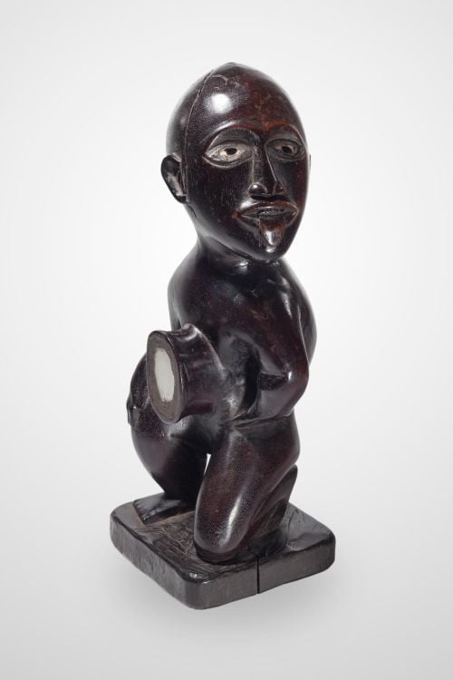 This statuette has eyes made of glass. The stomach has a cavity to contain a magical charge. In this cavity or receptacle, the magical charge, also called Bilongo, was sealed, which gave all its power to the fetish. The Bilongo is composed of various plant and animal substances and is placed in the cavity, closed by a resinous plug decorated with shells or mirror. Height: 40 cm Reproduced: Catalogue “Africa Babel: the Art of a Continent”, p. 118